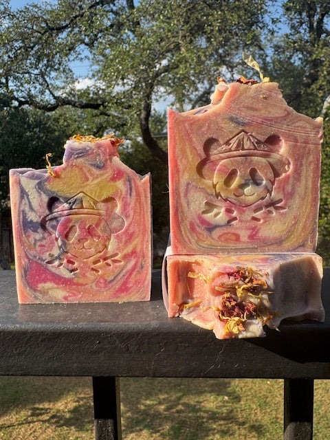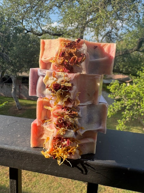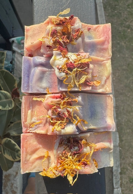 Ingredients- Lard, Olive Oil, Coconul Oil, Shea Butter, Caster Oil, Distilled Water, Sodium Hydroxide, Mica, Titanium Dioxide, Dried Calendula Petals, Dried Rose Petals